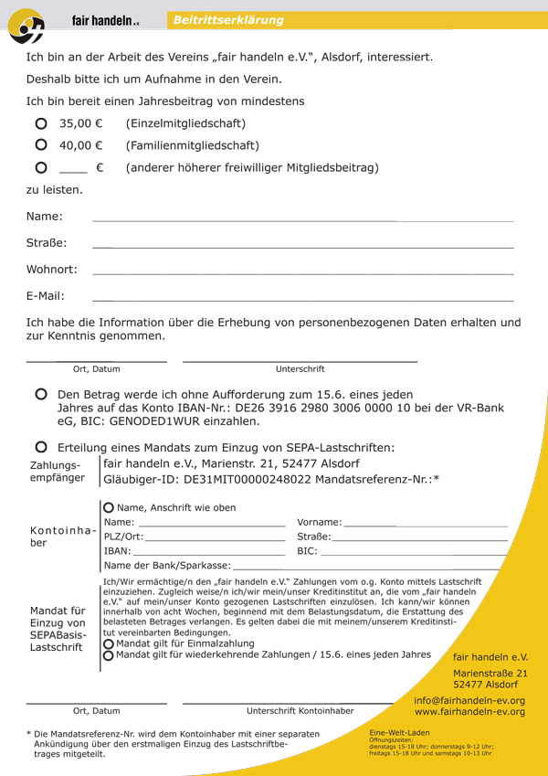 Vielen Dank für Ihr Interesse an einer Mitgliedschaft im Verein fair handeln e.V.. Wir freuen uns, dass Sie uns unterstützen wollen.
